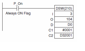 In this example, DSW(210) is used to read an 8-digit number from a digital switch and outputs the resulting value constantly to D0 to D3. The digital switch is connected through CIO 3 and CIO 104.