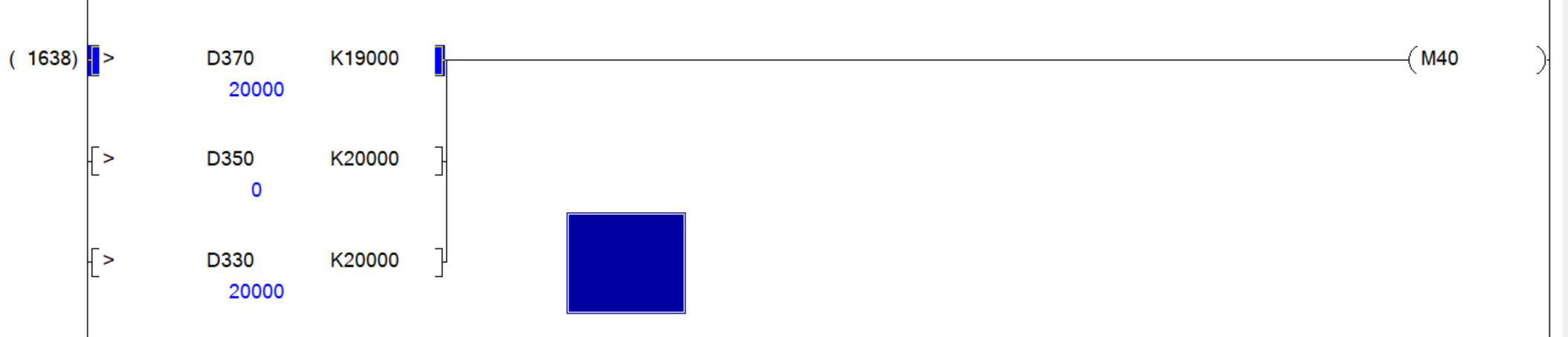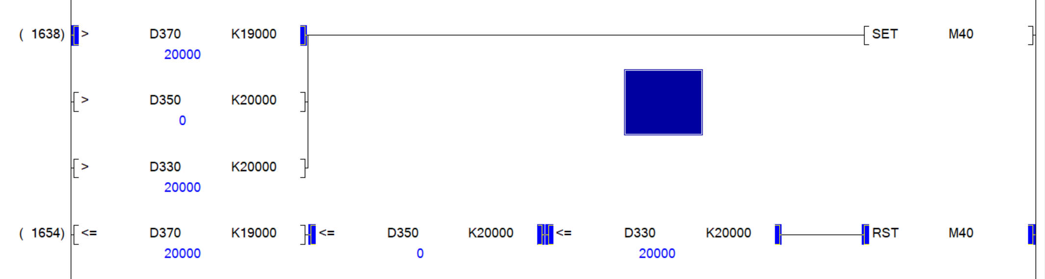 引用引用樓主8411852110于2025-11-11 15:18發表的 小白求助,關于寄存器比較的 : [attachment=315893] [attachment=315892] 用到三菱PLCFX3U的,有D370,D350,D330三個寄存器,是面板上調節速度的,要求是這三個寄存器的參數不得高于19000,20000,20000.如果任何一個超過這個數,那么就報警,報警的線圈用M40,報警之后這三個數調節到小于或等于要求的這三個數值后M40解除報警。寫了兩種,監視著參數都不行,其他地方沒用用到M40,只有這里用了,這里要么到斷開條件不斷開,要么到接通條件不接通,這是那里沒寫好。